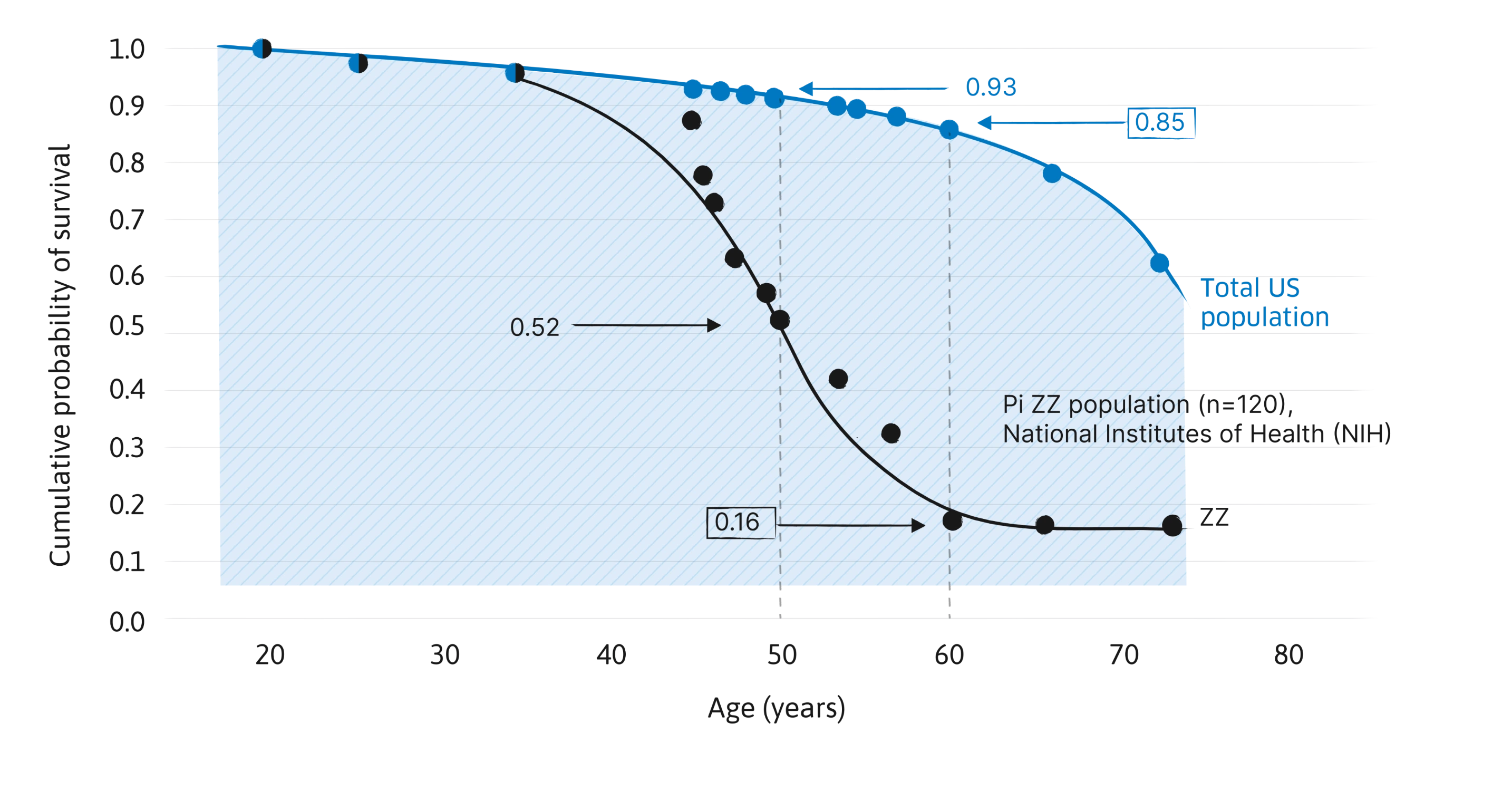 Survival analysis of individuals with severe alpha-1 (Pi ZZ) vs total US population8
