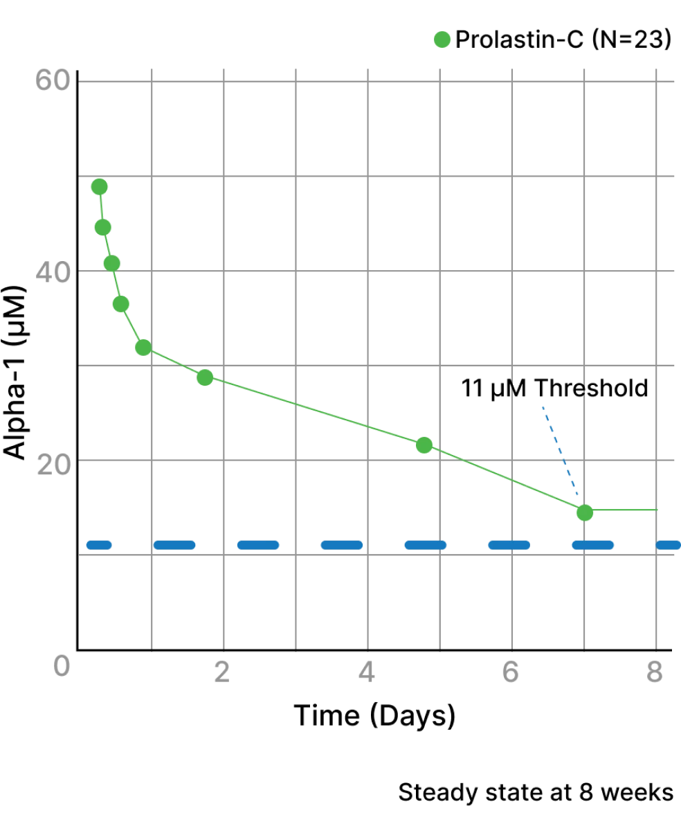 Therapy with PROLASTIN-C LIQUID raises AAT levels and antineutrophil elastase activity in the lungs. Maintaining blood serum levels above 11 µM has been postulated to provide protection, although this has not been proven.2